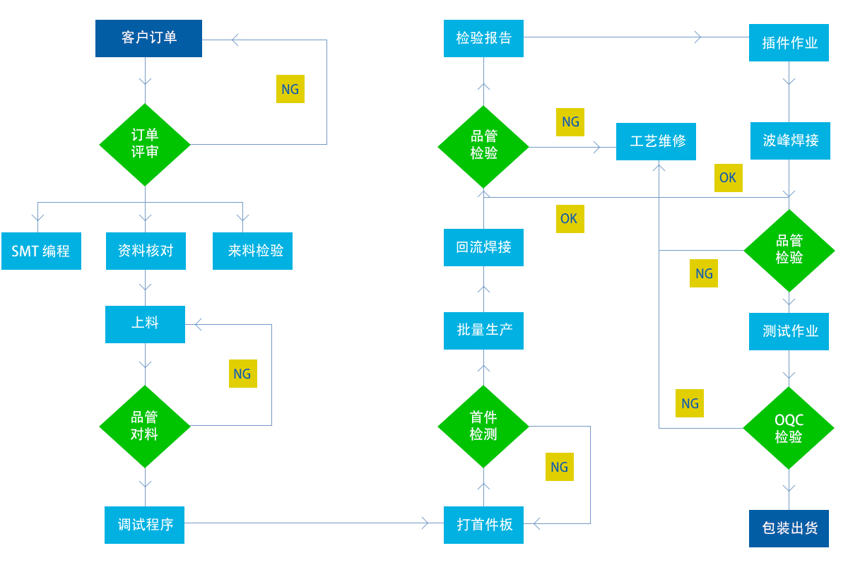 SMT貼片生產(chǎn)線4條,配備日本雅馬哈全自動貼片生產(chǎn)線、全自動錫膏印刷機、八溫區(qū)、十溫區(qū)回流爐、AOI、一體式貼片機等高端設(shè)備,芯片生產(chǎn)能力600萬焊接點/天,波峰焊加工日最大生產(chǎn)能力50萬點。具有安裝01005和0.40毫米間距BGA布局能力和電腦主板波峰焊接能力。